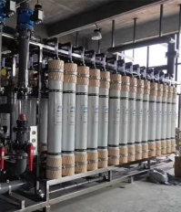 超濾膜的膜組件,其過濾通量控制在55L/㎡·h以內,過濾孔徑為100000DAL以內,超濾機組分為1個獨立機組。設置相應的反洗泵、藥洗泵、藥洗箱、壓縮空氣輔助脈沖清洗裝置,其反洗水源采用超濾產水水源。超濾產水的濁度要求在0.1NTU以內,且保證SDI值控制在3以內。出口配置在線濁度監測儀表。超濾產水的回收率需控制在3年產水率90%以上。超濾的運行及清洗控制采用全自動PLC控制,藥洗采用人工清洗。