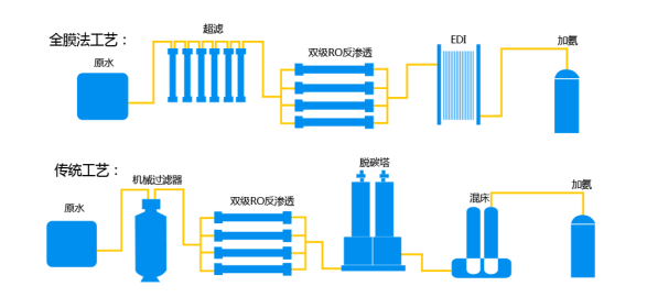 (3)電阻率在17兆歐/厘米以上:原水箱→原水泵→絮凝加藥裝置→石英過濾器→活性炭過濾→軟化器→精密過濾器→一級高壓泵→一級反滲透裝置→中間水箱→pH調節→二級高壓泵→二級反滲透裝置→RO水箱→EDI增壓泵→UV殺菌裝置→EDI裝置→超純水水箱→超純水增壓泵→拋光混床→微孔過濾→用水點