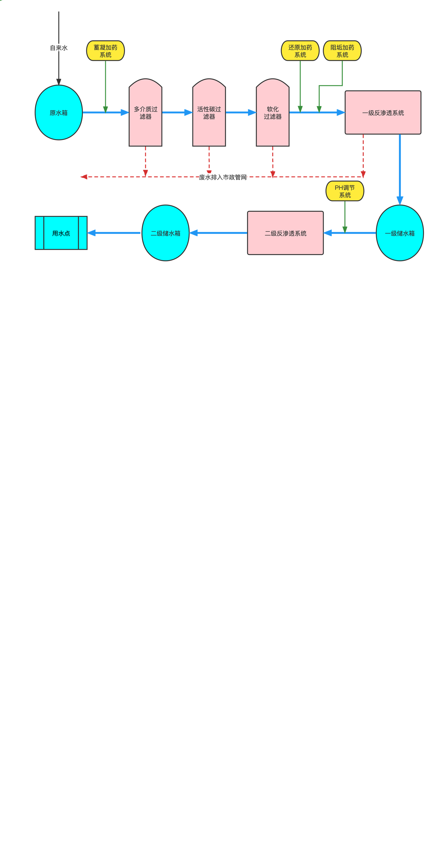 采用美國雙級反滲透膜分離技術和連續電去離子技術(EDI)等處理方法;利用高壓泵的加壓,反滲透膜的截留,可有效去除水中固體溶解物、有機物、膠體、微生物以及細菌等雜質。具有應用范圍廣、主動化程度高、占地少、能耗低、出水水質好。